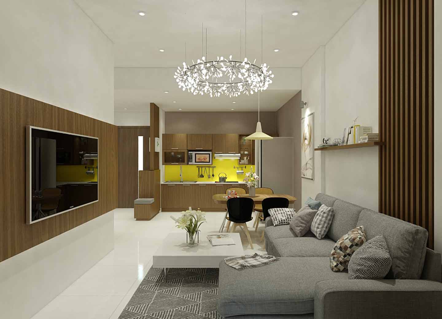 Phòng khách nhà ống – không gian mở liên kết với nhà bếp, lối đi cầu thang. Khu vực dành cho gia chủ tiếp đãi khách, bạn bè đồng nghiệp và sinh hoạt chung.